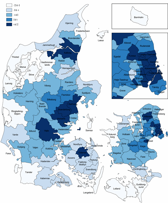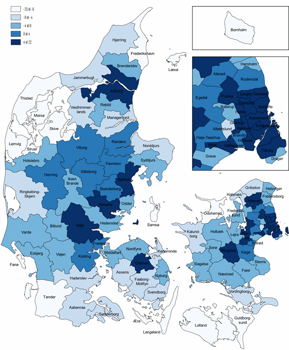 Ændringerne i beskæftigelse for hele landet er på knap 2 pct. fra 2008 til 2018, og den følger stigningen i befolkningen i den erhvervsaktive alder, som samlet voksede med 2,6 pct. Beskæftigelsen for indbyggerne i København kommune er steget med 22 pct., mens den er steget med 11 pct. i Aarhus. Ændringerne i beskæftigelsen følger i høj grad ændringerne i befolkningen i den erhvervsaktive alder, hvor der er solid vækst i de fire største kommuner og i omegnen af København og Aarhus, mens der er faldende beskæftigelse på Fyn uden for Odense kommune, på Vest- og Sydsjælland, Lolland- Falster, Sønderjylland og Vestjylland samt Nordjylland uden for Aalborg.