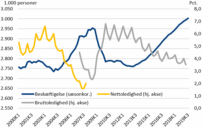 Bruttoledigheden nåede helt ned på 2,3 pct. svarende til 62.000 fuldtidspersoner i 3. kvartal af 2008, og toppede efterfølgende i 2010-2012 på knap 7 pct. svarende til 175-180.000 personer. Forskellen mellem de to tidspunkter er næsten oppe på 120.000 ledige, men forskellen i beskæftigelsen er endnu større, idet differencen er godt 170.000 personer. Det betyder, at den demografiske udvikling og andre faktorer har påvirket ledighed og beskæftigelse.