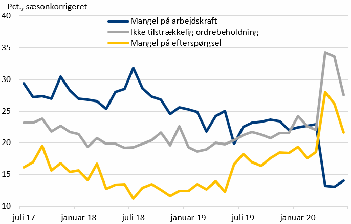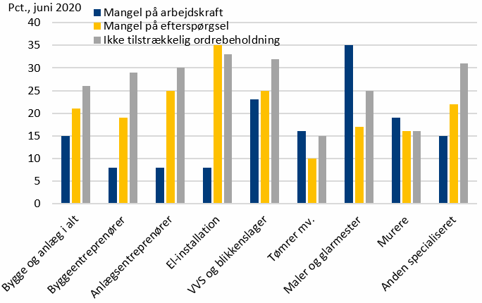 Manglen på ordrer og efterspørgsel steg kraftigt i bygge- og anlægsbranchen i april, men den er efterfølgende mindsket i takt med genoplukning af økonomien og ophævelse af kommunernes anlægsloft mv. I juni meldte 27,5 pct. af bygge- og anlægsvirksomhederne således om en ikke tilstrækkelig ordrebeholdning, mens 21,6 pct. af virksomhederne meldte, at mangel på efterspørgsel begrænsede produktionen, jf. figur 3. Da efterspørgselsmanglen toppede i april, havde 34,2 pct. af virksomhederne en utilstrækkelig mængde ordrer, og 28,0 pct. af virksomhederne fik begrænset produktionen som følge af mangel på efterspørgsel. Manglen på arbejdskraft er modsat forblevet lav efter at være faldet markant ned i april. I juni var 14 pct. af bygge- og anlægsvirksomhederne således begrænsede af mangel på arbejdskraft. Det er blot omtrent 1 procentpoint højere end i april og maj.