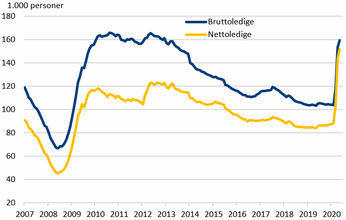Ledigheden steg yderligere i maj efter den historisk store månedlige stigning i april[1], jf. figur 1. Bruttoledigheden steg med 6.200 personer i maj, mens nettoledigheden steg med 7.800 personer. Bruttoledigheden er dermed steget med 55.600 personer siden februar, og nettoledigheden er steget med 63.300 personer over de tre måneder. Det er de største ledighedsstigninger over så kort en periode i den månedlige ledighedsstatistik, der rækker tilbage til 1988. Bruttoledigheden inkluderer også aktiverede ledige. Den større stigning i nettoledigheden illustrerer dermed et mindre omfang af aktivering blandt arbejdsløse under coronakrisen. Bruttoledigheden var på 159.300 personer i maj og ligger dermed omkring niveauet efter finanskrisen i årene 2010-2012. Nettoledigheden ligger med 151.600 personer i maj til gengæld meget over niveauet efter finanskrisen, hvilket dog skal ses i sammenhæng med det markant lavere niveau af aktivering.