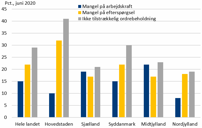Omfanget af mangel på efterspørgsel og arbejdskraft i bygge- og anlægsbranchen varierer på tværs af regionerne. I Hovedstaden er der mest udbredt mangel på efterspørgsel med en begrænsning af produktionen for 32 pct. virksomhederne og en utilstrækkelig ordrebeholdning for 41 pct. Bygge- og anlægsvirksomhederne i Syddanmark ligger omtrent på landsgennemsnittet med et omfang af utilstrækkelig ordrebeholdning på 30 pct. og mangel på efterspørgsel på 22 pct. Midtjylland og Sjælland har det største omfang af mangel på arbejdskraft blandt bygge- og anlægsvirksomhederne med henholdsvis 22 og 19 pct., der melder om problemet. Det mindste omfang af mangel på arbejdskraft findes i Nordjylland og Hovedstaden, hvor henholdsvis 8 og 10 pct. af virksomhederne angiver problemet.