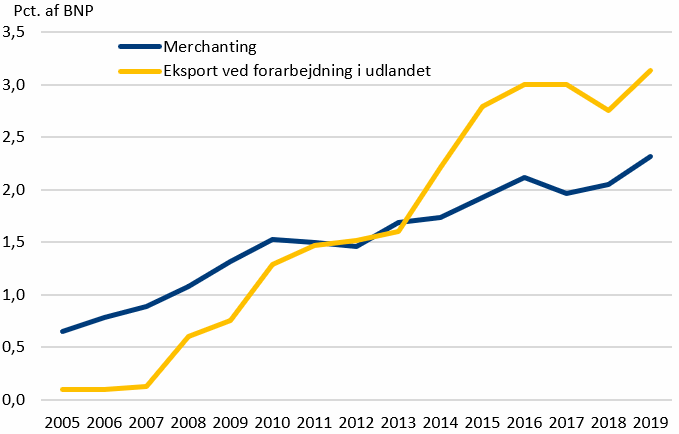 Danske virksomheders værdiskabelse og eksport er mere afhængig af stabile udenlandske markeder, end tal for eksport og import over den danske grænse viser. Således skaber danske virksomheder i større og større omfang indtægter ved at foretage handel og produktion i udlandet, og disse indtægter indgår også i opgørelsen af den danske betalingsbalance. Der kan være tale om varer, der er forarbejdet i udlandet under den danske virksomheds ejerskab, og som efterfølgende sælges direkte i udlandet uden passage gennem Danmark. Eller der kan være tale om ren handel med varer, der købes og sælges i udlandet uden nogen fysisk kontakt til Danmark, hvilket kaldes merchanting. Disse to fænomener udgjorde i 2019 en størrelse svarende til 5,5 pct. af BNP. Varer eksporteret direkte efter forarbejdning i udlandet udgjorde mest med 3,1 pct. af BNP, jf. figur 1, mens eksport af varer købt og solgt i udlandet uden kontakt med Danmark udgjorde 2,3 pct. af BNP. Den sidstnævnte såkaldte merchanting eksport er steget pænt siden 2005, så den i 2019 udgjorde 3½ gange så meget af BNP. Eksporten af varer forarbejdet og solgt direkte i udlandet er dog steget endnu mere markant, da denne udgjorde blot 0,1 pct. af BNP i årene 2005-2007.