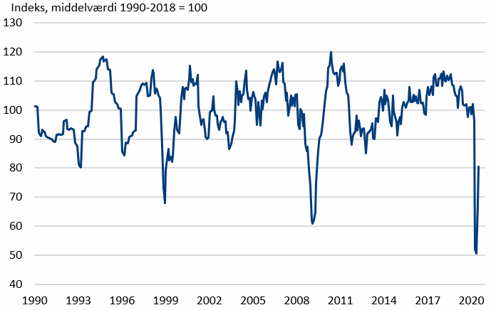 Erhvervstillidsindikatoren steg pænt i juli, ligesom det var tilfældet i juni. Men erhvervstilliden ligger fortsat lavt, da det historisk store fald i starten af coronakrisen fortsat ses i tallene, jf. figur 1. På trods af at være steget med 30 point over de seneste to måneder samlet, ligger indekset for erhvervstilliden på blot 80,5 i juli. Indekset er opgjort ud fra en historisk middelværdi på 100, så det ligger dermed stadig markant under normalniveauet.