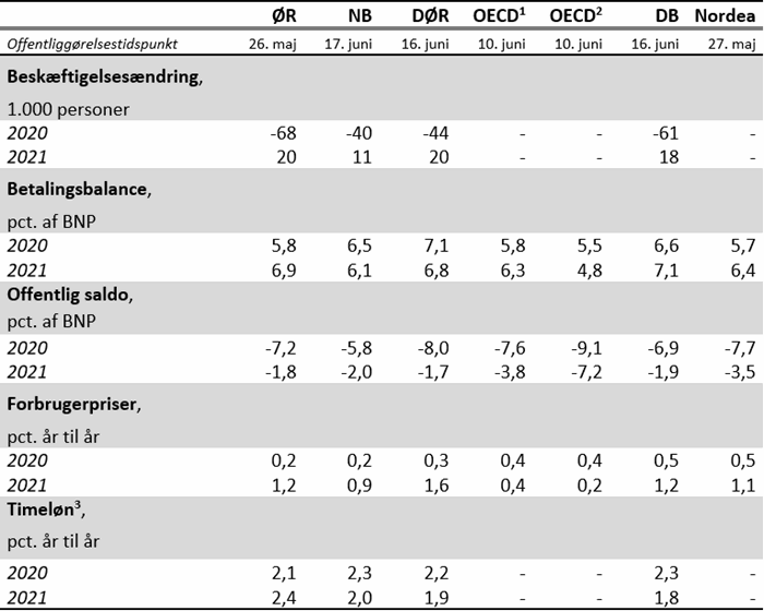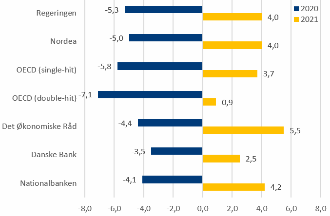 Regeringen offentliggjorde 26. maj en prognose for dansk økonomi i Økonomisk Redegørelse, som viste en nedgang i BNP på 5,3 pct. i 2020 efterfulgt af en fremgang på 4,0 pct. i 2021. En sådan udvikling vil være det største fald i BNP siden anden verdenskrig og den største stigning siden 1973. Disse historiske vækstrater skal selvfølgelig ses i lyset af den relativt abrupte og omfattende nedlukning af dele af dansk økonomi og især også økonomien hos mange af vores samhandelspartnere. Derudover kommer de samtidige ændringer i borgernes adfærd herhjemme og i udlandet. I den efterfølgende periode har en række andre institutioner offentliggjort skøn for udviklingen i dansk økonomi.