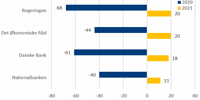 Da beskæftigelsen ikke ventes at falde så meget i 2020, ventes heller ikke så store efterfølgende stigninger. Regeringen og DØR skønner begge en stigning i beskæftigelsen på 20.000 personer i 2021, mens Danske Bank ligger på 18.000 personer, jf. figur 2. Nationalbanken ligger med 11.000 personer på det laveste skøn for beskæftigelsesvæksten i 2021. Det skal ses i sammenhæng med, at de også have det laveste skøn for beskæftigelsesfaldet i 2020. Samlet set betyder skønnene for udviklingen i 2020 og 2021, at beskæftigelsen i 2021 ventes at ligge mellem godt ¾ og 1½ pct. under niveauet i 2019. DØR har det mindste fald i deres vurdering, mens regeringen har det største. For regeringens prognose betyder det, at beskæftigelsen i 2021 ville have tabt omtrent det samme som BNP i forhold til 2019. Hvilket så også giver en uændret produktivitet pr. beskæftiget. Prognosen fra DØR indikerer omvendt en højere arbejdsproduktivitet, da de som nævnt forventer et højere BNP i 2021 i forhold til 2019.