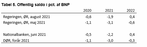Den offentlige saldo skønnes i redegørelsen at udgøre -1,9 procent af BNP i 2021 og 0,4 pct. i 2022. Det er en betydelig opjustering sammenlignet med maj-redegørelsen, hvor regeringen forventede at den offentlige saldo fortsat ville være negativ i 2022. Den offentlige saldo forventes allerede i 2022 at være positiv, fordi underskuddet i 2021 særligt er forårsaget af midlertidige udgifter til covid-19 relaterede forhold.