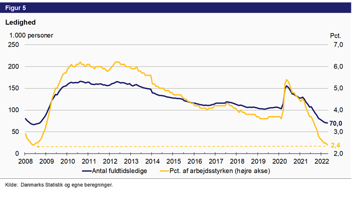 Maj har også bragt nye tal for ledigheden med tal for april måned. Her faldt ledigheden yderligere med 900 personer til lige godt 70.000 fuldtidsledige. Opgjort som procent af arbejdsstyrken, udgør de ledige 2,4 procent, hvilket er på niveau med ledigheden lige før finanskrisen i juni 2008 og det laveste ledighedsniveau, der er registreret i statistikkens historie.