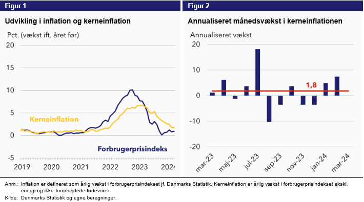 Ser man på den annualiserede månedsvækst i kerneinflationen, som mål for det underliggende inflationspres, har den over det seneste år ligget på 1,8 procent, bl.a. trukket ned af marts måneds annualiserede vækst på 0 procent. Det hører dog her med til historien, at marts måned historisk set er forbundet med en lav vækst i kerneinflationen (sæsoneffekter). Set henover det seneste år, er der altså et relativt uproblematisk niveau af kerneinflation lige under 2 procent.
