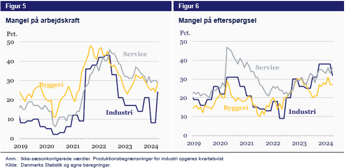 Manglen på efterspørgsel er som nævnt også udbredt, med omkring 30 procent af virksomhederne i de tre brancher der melder om dette som en produktionsbegrænsning. Ligesom det var tilfældet for manglen på arbejdskraft, er der i industrien sket en stor ændring, i dette tilfælde et fald, fra 38 til 32 procent.
