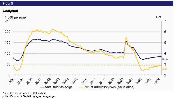Dagens ledighedstal viser en uændret eller meget marginalt faldende ledighed i marts, der nu har ligget praktisk talt stille i de første 3 måneder af 2024. Om end denne stilstand først er blevet os bekendt nu, hvor revisioner har nedjusteret antallet af ledige i både januar og februar, og dermed ført til den uændrede ledighed. Før dette var ledigheden svagt stigende.