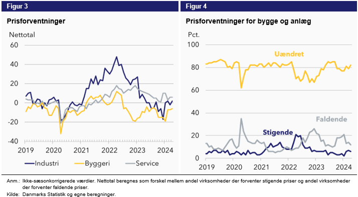 Som det har været tilfældet i de første fire måneder af 2024, er der i serviceerhvervene en lille overvægt af virksomheder der forventer stigende priser (nettotal > 0), omtrent lige mange indenfor industrien der forventer stigende og faldende priser (nettotal = 0), og lidt flere indenfor byggeriet der forventer faldende priser (nettotal < 0). I et lidt længere perspektiv er der særligt i industrien sket et stort fald, hvor det i starten af 2022 var over 40 procentpoint flere virksomheder der forventede stigende ift. faldende priser. Helt så vild har udviklingen ikke været for de øvrige brancher, hvor forventningen i byggeriet siden midten af 2022 har ligget under 0 – svarende til en overvægt af virksomheder der forventer faldende priser.