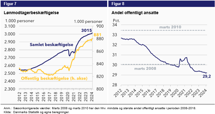 Idet væksten fortsat særligt tilfalder den private sektor forbliver andelen af offentligt ansatte historisk lav, og er på nuværende tidspunkt 29,2% af den samlede lønmodtagerbeskæftigelse, og har altså i statistikkens levetid ikke været lavere.