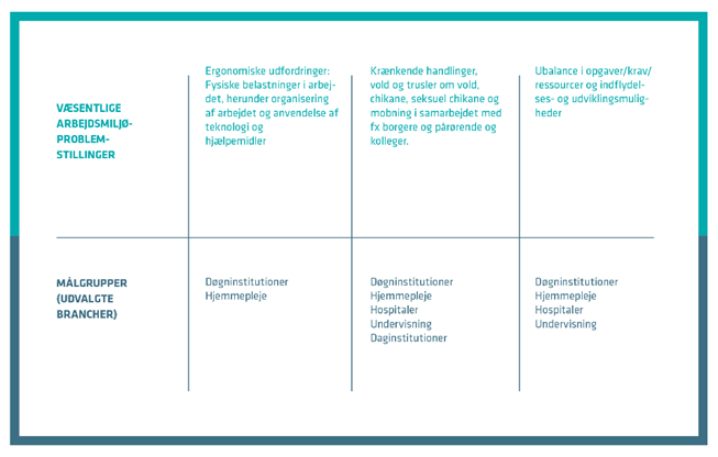 På det kommunale område er døgninstitutioner og hjemmepleje, skoler og dagtilbud udpeget i aftalen som områder, hvor der opleves størst udfordringer indenfor de valgte arbejdsmiljøområder. Arbejdspladser inden for disse områder skal derfor særligt arbejde med at styrke forebyggelsen og nedbringe følgende ergonomiske og psykiske risici og belastninger: