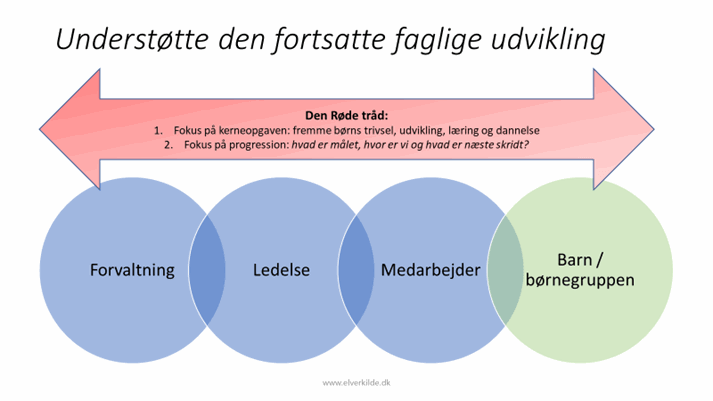 Faglig ledelse handler også om at have viden om og indsigt i det pædagogiske arbejde Lederne skal kunne spejle viden fra forskning ind i praksis, og samtidig gøre det konkret. Lederne skal vide, hvad kvalitet er, og de skal kunne formidle det, så de reducerer kompleksiteten i det. Det drejer sig om det gode børneliv her og nu, og om hvorvidt dagtilbuddet lykkes med at skabe rammer for det gode børneliv. Det handler også om det langsigtede - om børnenes muligheder for udvikling, læring, trivsel og dannelse, som de klarer sig godt senere i livet. Det er også centralt, at medarbejderne har en viden om, hvordan små børn lærer og udvikler sig. Derudover skal medarbejderne have viden om læreplanens indhold, samt kompetencer til at arbejde med børnenes udviklingsmæssige progression på en bevidst og kontinuerlig måde.