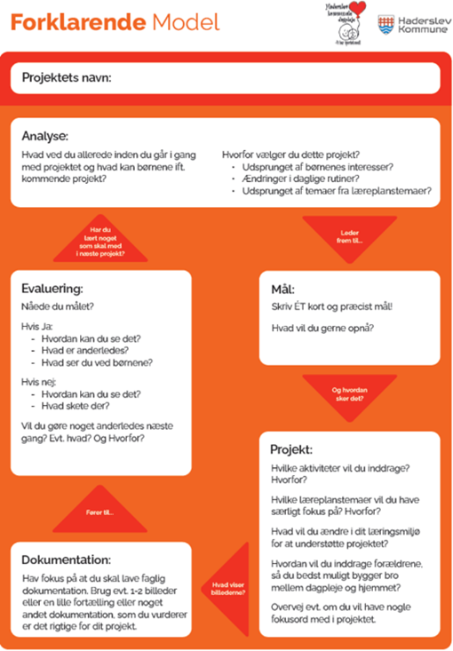 Alle dagplejere skal nu bruge modellen minimum én gang hvert kvartal, ger-ne flere. Modellen er cirkulær, der kan genbruges næste gang en dagplejer vil arbejde med samme indsats. Dagplejeren begynder med at definere ét mål for den indsats, de vil sætte i gang. Målet skal handle om, hvad børnene skal have ud af indsatsen. Derefter skal indsatsen beskrives så detaljeret som muligt inden den afprøves, og der indsamles dokumentation på, om indsatsen har haft den ønskede betydning for børnene.
