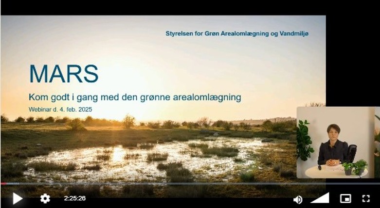 MARS - Multifunktionel ArealRegistrering - er en platform, der samler og understøtter alle indsatser på arealer, der er med til at realisere de nationale mål for kvælstofreduktion, udtagning af kulstofrige lavbundsjorde og skovrejsning, Den 4. februar 2025 afholdt SGAV et webinar for kommuner og lokale treparter om brugen af MARS. Du kan se optagelsen fra webinaret herunder.