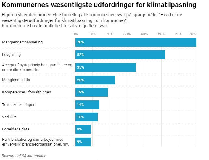 Det der oftest bremser klimatilpasningsprojekter, er problemer med finansiering. Kommunerne efterspørger for det første tydeligere og mere brugbare modeller til at beregne hvad berørte lodsejere skal betale – men også, at der fra statslig side afsættes fondsmidler til at understøtte at nødvendige klimatilpasningsprojekter kan realiseres.