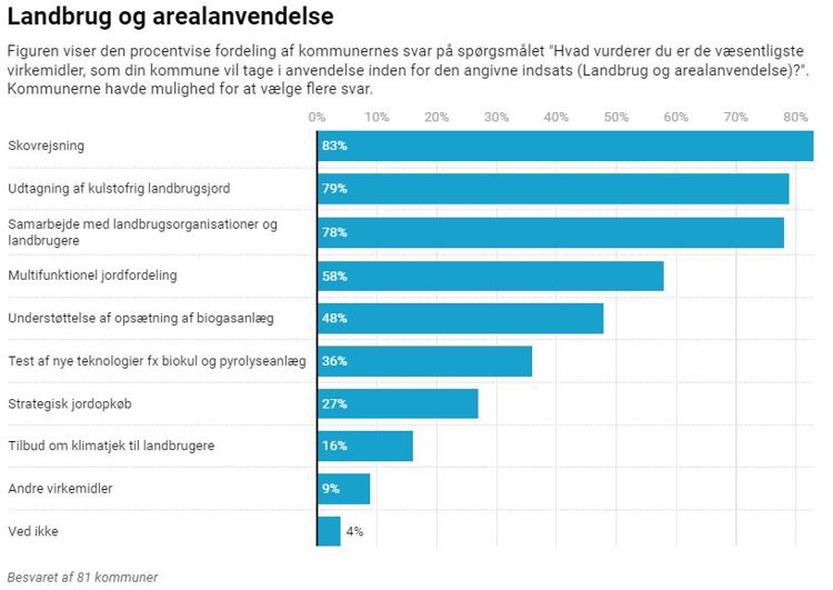 Samtidig er der meget stor bredde i kommunernes indsatsområder. Også klimatilpasning er i top, hvor 82 pct. vægter til pasningen til konsekvenserne af klimaforandringerne højt, men transport og mobilitet, affald og landbrug og arealanvendelse følger lige efter.