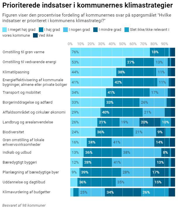 Stort set alle kommuner har omstilling til grøn varme som højdespringeren i hvilke indsatser, der prioriteres i kommunernes klimahandleplaner. Adspurgt til hvilke indsatser, der er prioriteret i kommunens klimahandleplan, svarer hele 94 pct. at de prioriterer omstilling til grøn varme højt. 83 pct. prioriterer energieffektivisering og 80 pct. svarer omstilling til vedvarende energi.