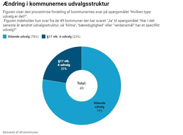 Kommunernes Klimabarometer 2022 viser, at halvdelen af kommunerne efter Kommunalvalget i november 2021 har fået ny udvalgsstruktur, hvor klima er blevet det centrale omdrejningspunkt for kommunens fagudvalg. Hovedparten af de kommuner, der har svaret ”andet”, har et kombineret klima- og enten teknik-, natur- eller miljøudvalg. Det viser, at klimaområdet prioriteres højt på den politiske dagsorden.