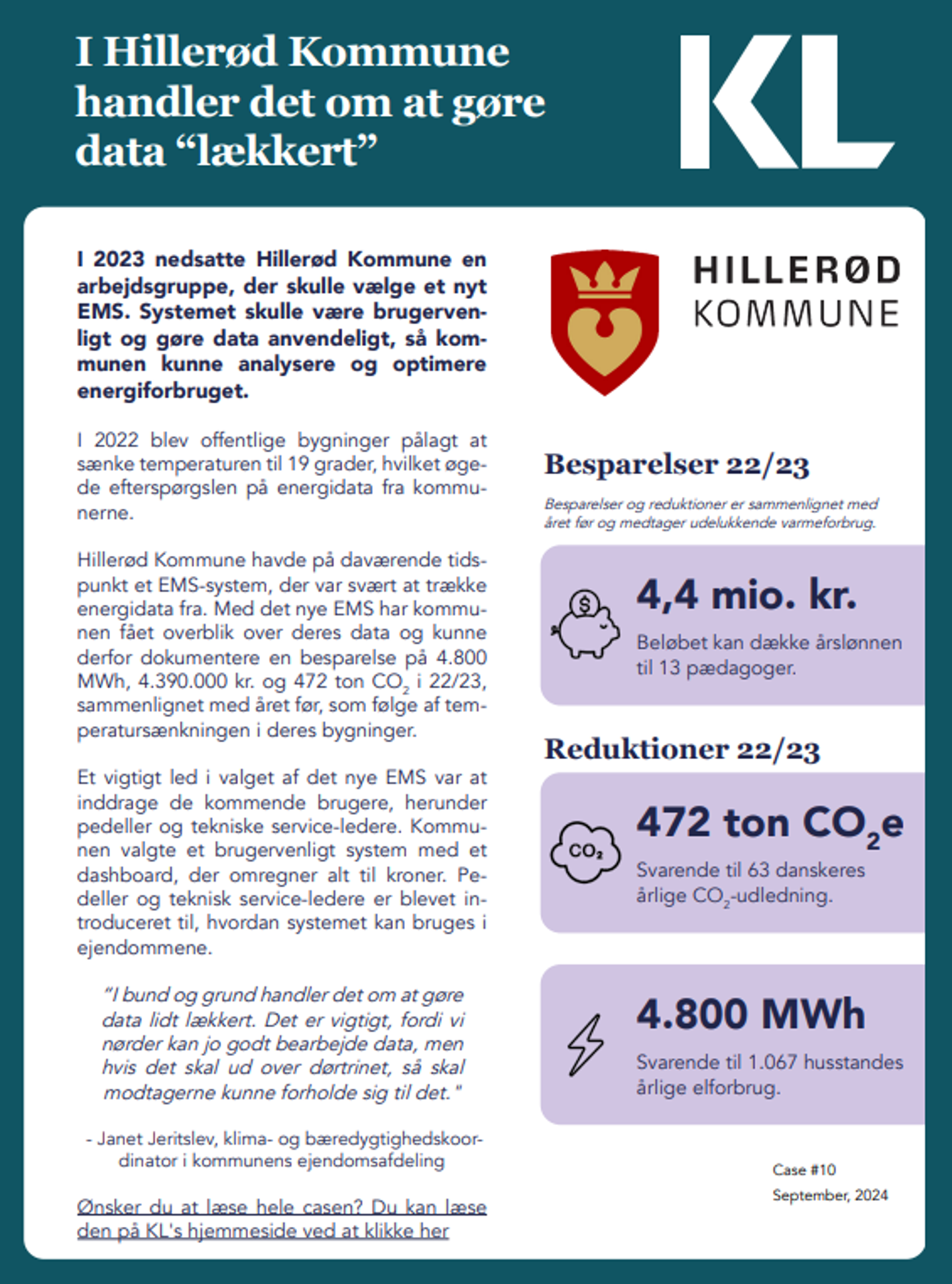 Dengang havde Hillerød Kommune et EMS-system, som var svært at trække energidata fra. Med det nye EMS har kommunen fået overblik over sine data og kunne dokumentere en besparelse på 4800 MWh i år 22/23 sammenlignet med året før som følge af temperatursænkningen i deres bygninger. For samme periode kunne de vise en besparelse på 4.390.000 kr. på varmeregningen og en reduktion af CO2-udledningen på 472 ton.