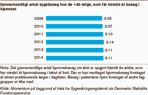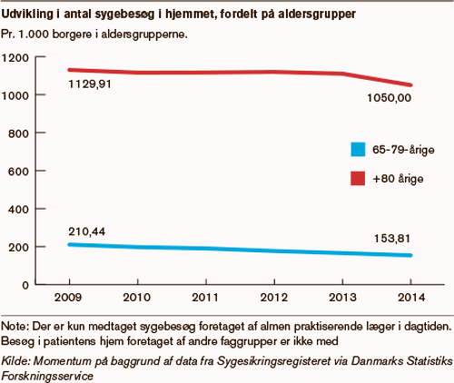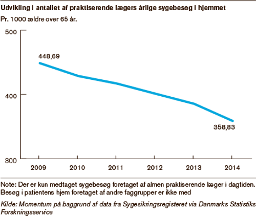 Når det ringer på hos de ældste danskere, er det sjældnere og sjældnere doktor Hansen, der står på den anden side af døren. Fra 2009 til 2014 faldt antallet af praktiserende lægers sygebesøg i hjemmet pr. 1000 +65-årige borgere med hele 20 procent. Det viser en ny Momentum-analyse, som også afslører, at faldet er størst blandt de 65-79-årige, hvor antallet af besøg er faldet med 27 procent, mens det er faldet syv procent blandt borgere over 80 år.