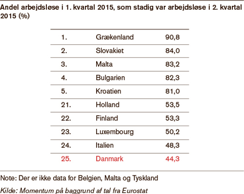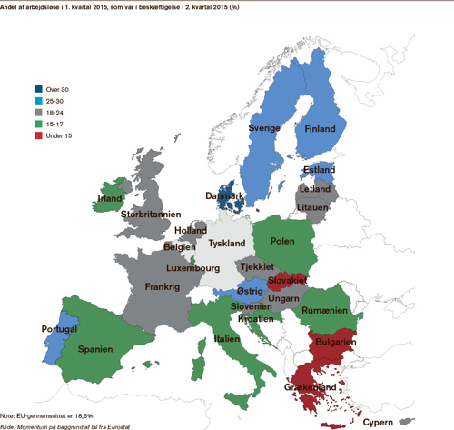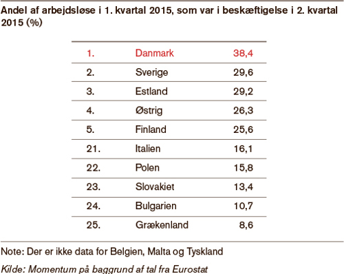 Danmark er det land i EU, hvor den største andel arbejdsløse kom i job fra første til andet kvartal i 2015. Over 38 procent af de arbejdsløse kom i arbejde i Danmark, mens det kun lykkedes for under 30 procent af de arbejdsløse i Sverige, der ligger på andenpladsen. Det fleksible danske arbejdsmarked er hovedforklaringen på topplaceringen, men der er plads til forbedringer.