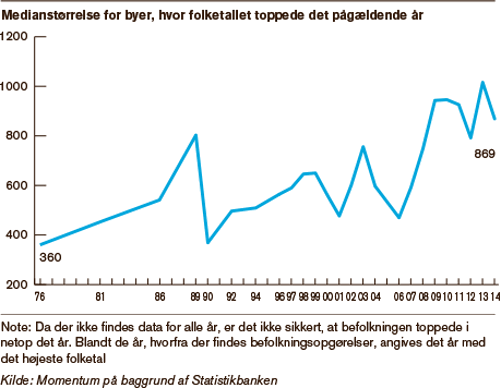 Det bliver sværere og sværere for de mindste byer i Danmark at tiltrække tilflyttere. Den normale størrelse for de byer, der får flere indbyggere, er fordoblet siden 1980’erne, viser en ny Momentum-analyse baseret på tal fra Danmarks Statistik. I slutningen af 1970’erne og begyndelsen af 1980’erne var det typisk byer med cirka 450 indbyggere, der mistede rollen som lokale vækstcentre og måtte se i øjnene, at indbyggertallet enten stagnerede eller faldt. I 2015 er den udvikling nået til byer med omkring 900 indbyggere, og i 10’erne er der årligt flere byer, hvor fremgang i folketallet er blevet til stagnation eller fald.