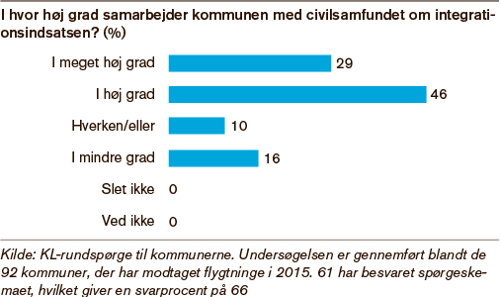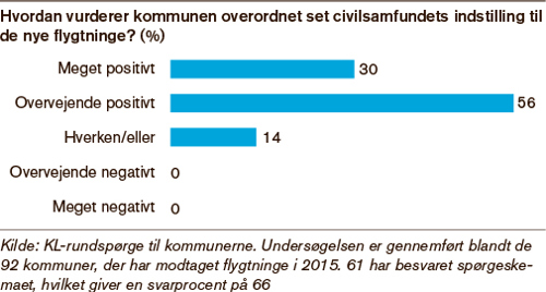 Rundspørgen viser også, at 30 procent af kommunerne vurderer, at civilsamfundet i deres kommune har en meget positiv indstilling til de nye flygtninge. 56 procent mener, at civilsamfundet er overvejende positivt, mens 14 procent svarer, at civilsamfundet hverken er positivt eller negativt.