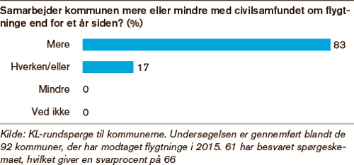 Frivillige foreninger, store organisationer og løst definerede borgergrupper fylder mere og mere i kommunernes arbejde med at tage imod et stadigt stigende antal flygtninge. En KL-rundspørge til kommunerne viser, at 83 procent af kommunerne samarbejder mere med civilsamfundet i dag, end de gjorde for et år siden. De resterende 17 procent hverken samarbejder mere eller mindre med civilsamfundet.