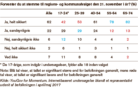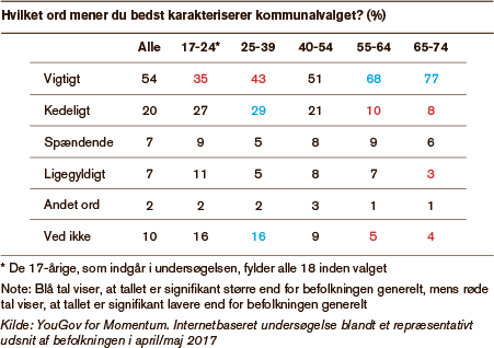 Momentums undersøgelse viser, at der er en stor udfordring i at få vakt de unges interesse for kommunalvalget. Kun 35 procent af de 17-24-årige synes, at kommunalvalget er vigtigt mod et gennemsnit for hele befolkningen på 54 procent. 38 procent af de unge opfatter i stedet valget som enten "kedeligt" eller "ligegyldigt".