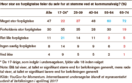 Det er ikke bare den lave forventning til valgdeltagelsen, der adskiller de unge fra de øvrige aldersgrupper. Det gælder også i forhold til forpligtelsen til at stemme. Her svarer 35 procent af de unge mellem 17 og 24 år, at de føler en ret lille forpligtelse eller ingen forpligtelse for at stemme. Blandt de 65-74-årige svarer kun otte procent det samme.