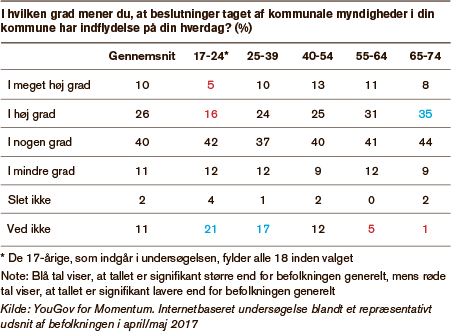 I Momentums undersøgelse svarer også kun 21 procent af de unge mellem 17 og 24 år i høj eller meget høj grad til spørgsmålet "I hvilken grad mener du, at beslutninger taget af kommunale myndigheder i din kommune har indflydelse på din hverdag", mens det er dobbelt så mange blandt de +55-årige.
