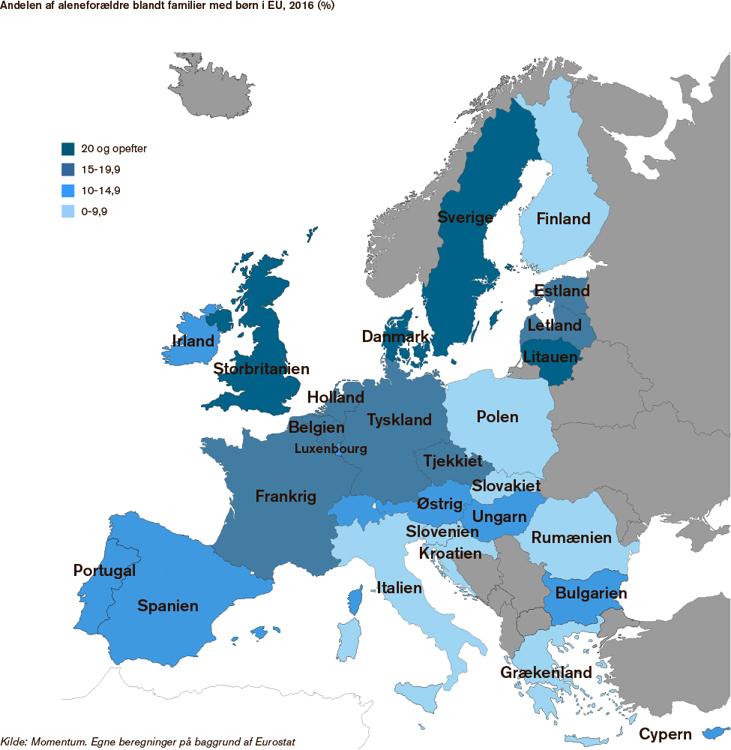 I den modsatte ende ligger Kroatien hvor kun 5,3 procent af børnefamilierne, er alene-forældre, mens de i lande som Sverige, Frankrig og Tyskland udgør henholdsvis 25, 19,7 og 16,3 procent. Det viser en ny Momentum-kortlægning på baggrund af tal fra Europa-Kommissionens Eurostat.