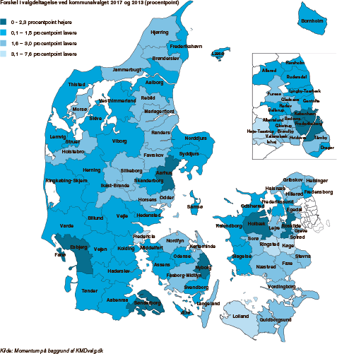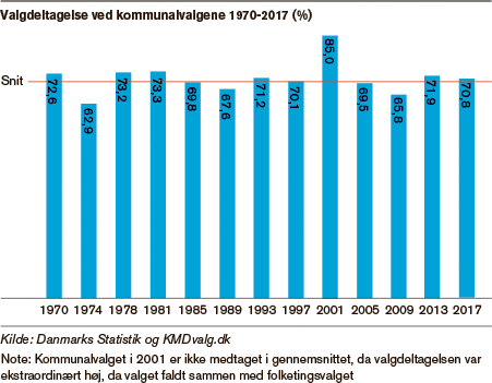 Selvom der altså var otte kommuner, der oplevede en stigning i valgdeltagelsen, så var der overordnet en tilbagegang på 1,1 procentpoint, så man landede på en samlet stemmeprocent på 70,8 procent. Det skal ses i lyset af, at man ved kommunalvalget i 2013 havde haft en stor stigning fra det dårlige resultat i 2009 på 65,8 til 71,9 procent. Valgdeltagelsen på 70,8 procent ligger da også over den gennemsnitlige på 69,8 procent siden kommunalreformen i 1970. Det kræver dog, at man ser bort fra kommunalvalget i 2001, som lå på samme dag som folketingsvalget, og derfor ligger markant højere end resten.