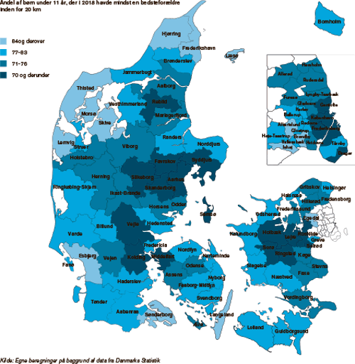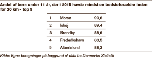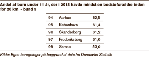 I Frederiksberg, Skanderborg, København og Aarhus Kommune har mellem 61 og 62 procent højst 20 kilometer til bedsteforældrene. Man finder kun en lavere andel på Samsø, hvor det er 53 procent.