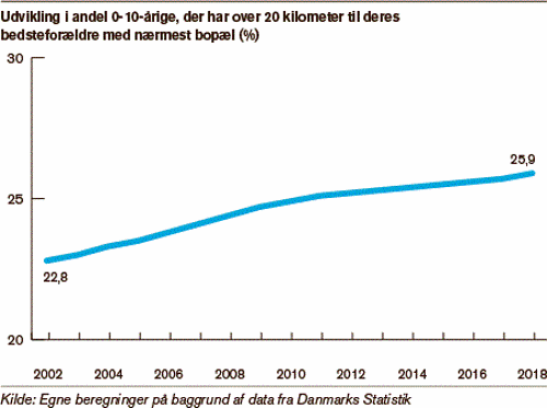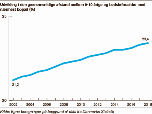 26 procent af de danske børn bor over 20 kilometer væk fra deres bedsteforældre, og andelen er stigende. Samtidig er det færre, der bor helt tæt på deres bedsteforældre. Afstanden kan give praktiske problemer i hverdagen, men forholdet behøver ikke blive dårligere.