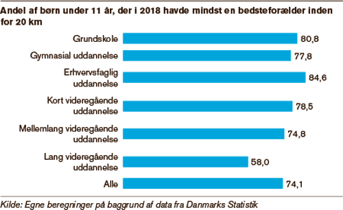 Momentums analyse viser også, at forældrenes uddannelsesniveau har stor indflydelse på, om bedsteforældrene bor tæt på. Således er det kun 58 procent af 0-10-årige, hvis forældre har lange videregående uddannelser, der har bedsteforældre inden for 20 kilometer. Det gælder for 85 procent af børnene med faglærte forældre. Billedet afspejles i, at det især er i universitetsbyerne og tæt på dem, at flest børn har langt til bedsteforældrene.