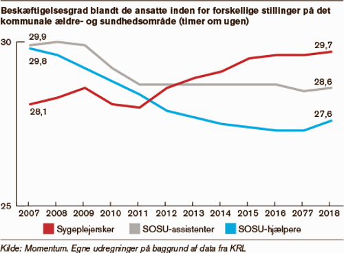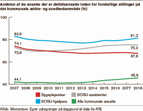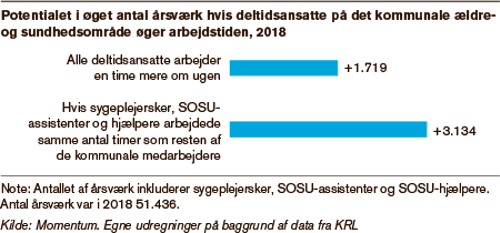 Samtidig viser en ny Momentum-analyse at langt hovedparten af de ansatte på området er deltidsansatte. Blandt SOSU-hjælperne er det 81 procent på deltid, mens det gælder 75 procent af SOSU- assistenterne og 68 procent af sygeplejerskerne. Til sammenligning er 46 procent af alle de kommunalt ansatte på deltid. Der er derfor et potentiale i at kunne afbøde noget af rekrutteringsudfordringen ved at få flere til at gå op i tid eller komme på fuldtid. Momentums analyse viser således, at man allerede ved at få alle på deltid til at gå en time op i arbejdstid vil få, hvad der svarer til godt 1.700 ekstra årsværk. Og hvis det kunne lykkes, at få deres gennemsnitlige arbejdstid til at ligne resten af de kommunalt ansatte, vil man få godt 3.100 ekstra årsværk.