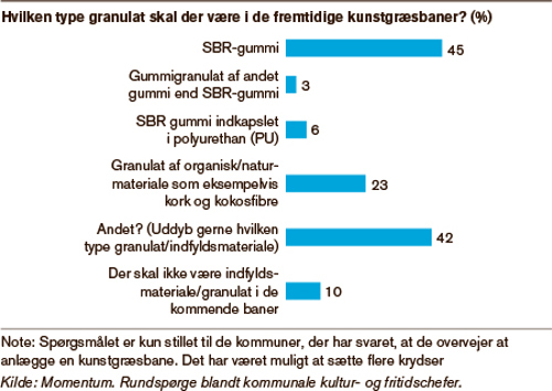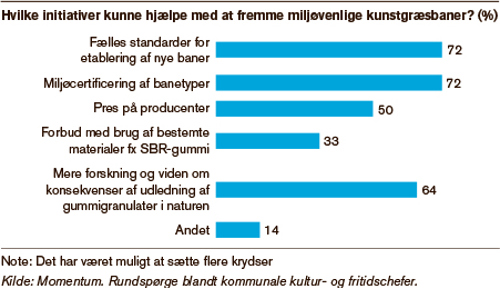 Momentums undersøgelse viser, at mange af de kommuner, der overvejer eller har vedtaget at lave nye kunstgræsbaner, gerne vil have alternativer til gummigranulatet. Samtidig er der dog også mange kommuner, som efterlyser mere viden samt eksempelvis fælles standarder for etablering af nye baner eller miljøcertificering af banetyper.