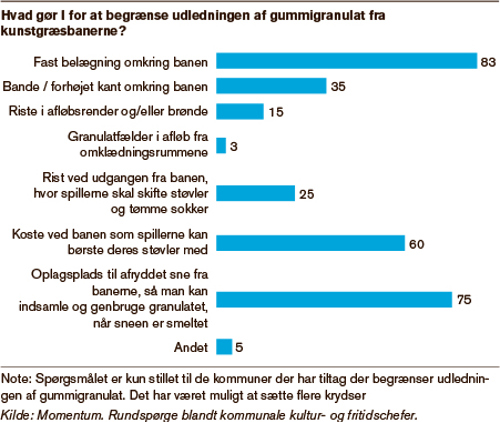 Miljøstyrelsen har lavet vejledning til, hvordan man bedst indretter kunstgræsbaner, og det omfatter også forslag til tiltag, der kan mindske udledningen af granulat. Her viser Momentums rundspørge, at hele 83 procent af kommunerne, der har indført tiltag, har lavet en fast belægning rundt om banen, 75 procent har lavet oplagsplads til afryddet sne fra banerne, så man kan indsamle og genbruge granulatet, når sneen er smeltet, 60 procent har koste ved banerne, som spillerne kan børste deres støvler med, mens 35 procent har bander eller forhøjet kant rundt om banen. Herudover har 25 procent lavet riste ved udgangen fra banen, hvor spillerne skal skifte støvler og sokker, mens kun få har lavet riste i afløbsrender og granulatfælder i afløbene fra omklædningsrummene.
