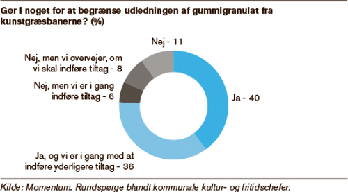 De fleste succeshistorier kommer dog oftest med knaster, og sådan er det også med kunstgræsbanerne. På langt de fleste baner bliver der spredt gummigranulat, som kan ende i naturen. En helt ny Momentum-rundspørge blandt kommunerne viser, at 92 procent af banerne er 3. generations kunstgræsbaner, hvor man strør granulat ud på banen, og at der i næsten alle banerne er tale om en form for gummigranulat. Til gengæld viser undersøgelsen også, at 76 procent af kommunerne allerede har indført tiltag til at reducere udledningen af granulat, yderligere 6 procent er i gang, og 8 procent overvejer at indføre tiltag.