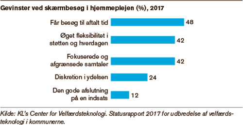I undersøgelsen svarer 42 procent af kommunerne, at bedre muligheder for fokuserede og afgrænsede samtaler er den største gevinst ved skærmbesøg i hjemmeplejen.