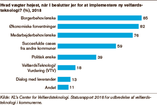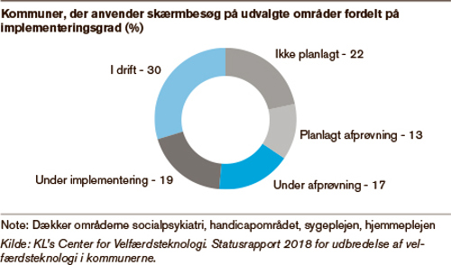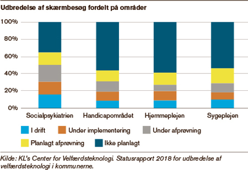 Teknologien er mest udbredt i socialpsykiatrien, hvor 30 procent af kommunerne enten har skærmbesøg i drift eller under implementering. Det efterfølges af hjemmeplejen med 20 procent og handicapområdet med 19 procent og til sidst sygeplejen med 18 procent.