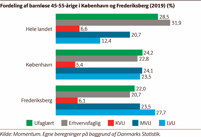 En ny Momentum-analyse viser således, at 24,9 procent af kvinderne i aldersgruppen i Københavns Kommune er barnløse, mens det er 24,2 procent i Frederiksberg Kommune. Det er væsentligt mere end landsgennemsnittet på 13,6 procent, og også noget mere end nummer tre på listen, Ærø, hvor 20,3 procent af de 45-55-årige kvinder er uden barn.
