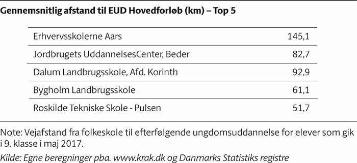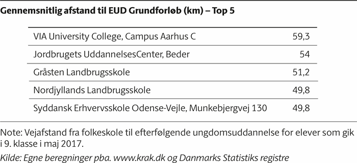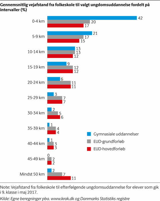Elever på almene gymnasier har i gennemsnit 10 kilometer til skole, mens elever på erhvervsskolernes grundforløb har hele 22 kilometer. De fleste unge på erhvervsuddannelserne er ret afklarede om deres fremtidsplaner, og derfor kan den større afstand især have en betydning for den gruppe af unge, der er usikre på, om de skal vælge en erhvervsuddannelse.