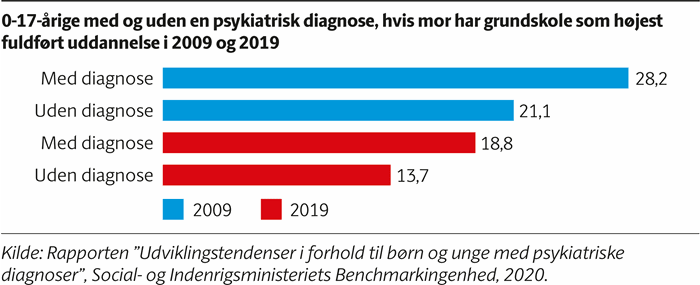 Opgørelsen viser blandt andet, at hvor det i 2009 var 11 procent af de 0-17-årige med mindst en diagnose, der kom fra en lavindkomstfamilie, så var det i 2019 faldet til ni procent. Samtidig har andelen af børn uden diagnoser fra lavindkomstfamilier ligget stabilt begge år. Det samme gør sig gældende, når man ser på andelen, der bor i almene boliger, hvor der er også sket et fald i gruppen med diagnoser, mens andelen er uændret for børn uden diagnoser. Endelig er der også sket et markant fald i andelen med en psykiatrisk diagnose, som har en mor, der har grundskolen som højest fuldførte uddannelse. Det er faldet fra 28 procent i 2009 til 19 procent i 2019. Det samme gælder, når man ser på fædrene, hvor der er sket et fald fra 27 til 22 procent.
