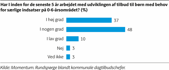 I rundspørgen svarer 37 procent af dagtilbudscheferne, at de i høj grad arbejder med udviklingen af tilbud til børn med særlige behov, mens 48 procent svarer i nogen grad. Samtidig svarer 27 procent, at de i høj grad anvender mellemformer, mens 59 procent svarer i nogen grad.