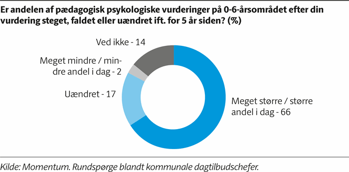 Her vurderer 85 procent, at andelen af børn, der har behov for særlig indsats i eller uden for det almene dagtilbud er større eller meget større i dag sammenlignet med for 5 år siden. I samme periode vurderer 63 procent, at kompleksiteten i de særlige indsatser for de enkelte børn i almene dagtilbud er blevet større, ligesom 62 procent vurderer, at andelen der har brug for et decideret specialtilbud er steget.