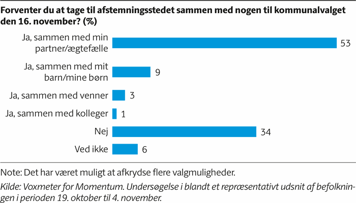 Momentums undersøgelse viser også, at knap 2 ud af 3 har tænkt sig at tage af sted til afstemningsstedet sammen med andre. Igen er topscoreren partneren, som 53 procent regner med at følges med. 9 procent vil følges med sine børn og 3 procent med venner. 34 procent regner dog ikke med at følges med nogen.